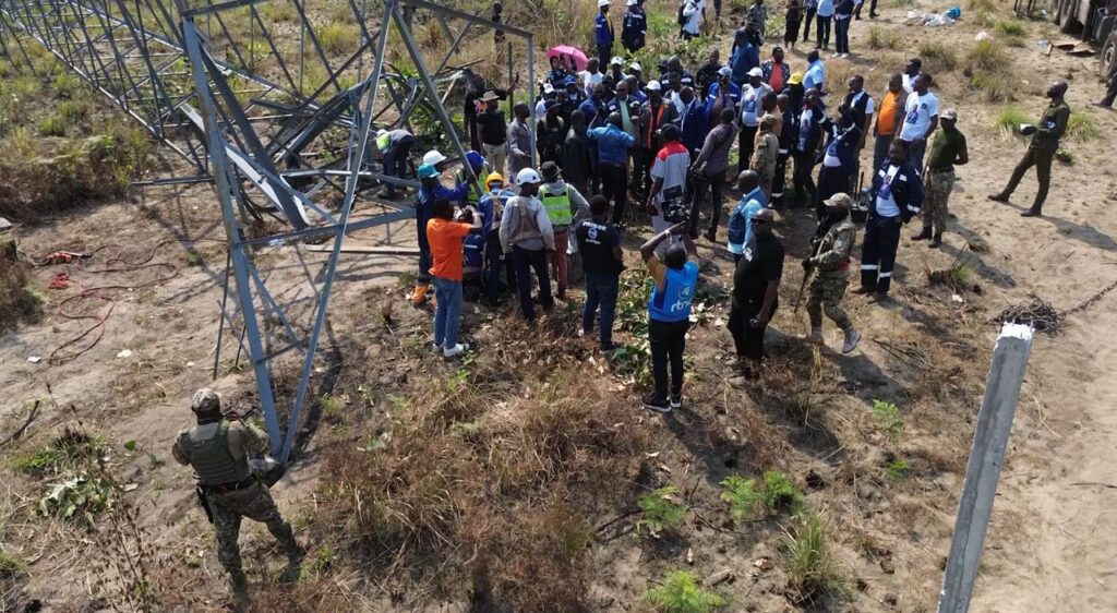 Deuxième halte : le site de Kimpoko à Maluku, où un pylône de haute tension de 220 KV reliant Maluku et Bandundu ville a été récemment vandalisé, compromettant la distribution de l’électricité dans plusieurs quartiers périphériques de Kinshasa. Accompagné de ses équipes techniques et de la sécurité, le DG de la SNEL a constaté l’ampleur des dégâts. Il a promis réhabilitation et un renforcement des mesures de protection des infrastructures stratégiques :