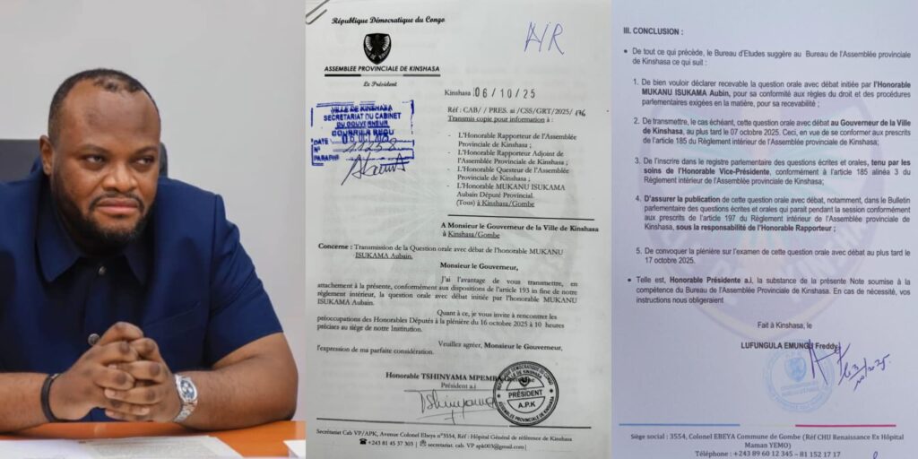 D’après nos sources, la mission confiée au vice-gouverneur est claire : faire pression sur le Bureau d’études de l’Assemblée afin qu’il revoie son avis favorable sur la recevabilité de la question orale initiée par le député Mukanu. Objectif : obtenir l’annulation pure et simple de la convocation du gouverneur, initialement fixée au 16 octobre 2025.