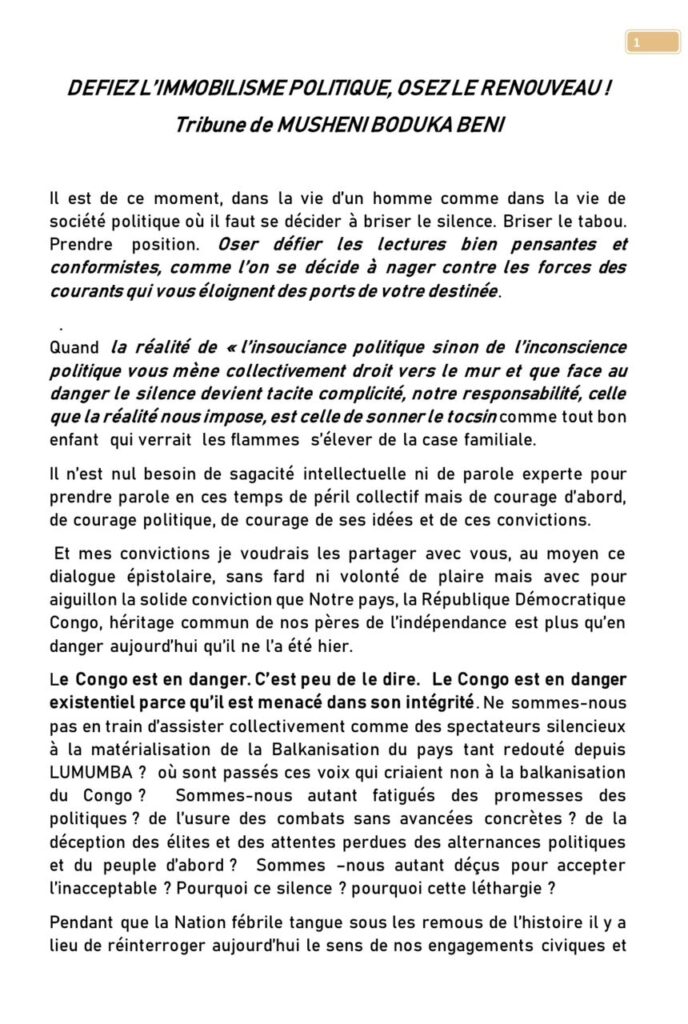 Beni Musheni, initiateur du Mouvement Le RENOUVEAU POUR L’ÉMERGENCE DE LA RDC, s’est exprimé sur la situation que traverse actuellement le Congo Kinshasa. À travers une tribune, il a exprimé sa préoccupation, tout en proposant des recommandations.