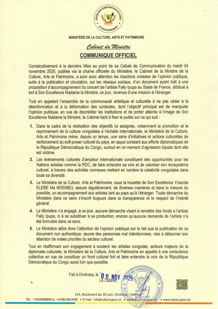 Le Ministère encourage et accompagne régulièrement les artistes congolais dans le respect total de la transparence et de l’intérêt général. Cependant, aucun engagement financier ni appui direct n’a été accordé pour ce concert, et aucune demande officielle n’a été formulée par l’artiste.