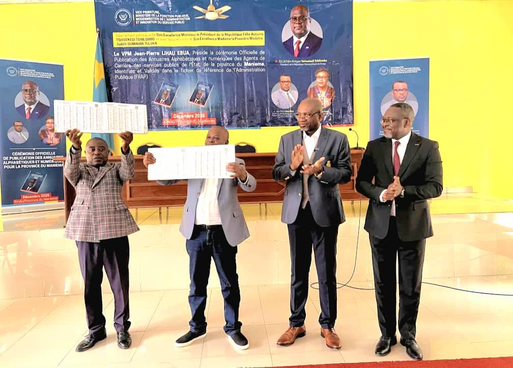 Bonne nouvelle pour les agents publics de l’ensemble de la province du Maniema. Au nom du Vice-Premier Ministre, Ministre de la Fonction publique, Jean-Pierre Lihau, le Directeur de cabinet Tupa Kamango a présidé, ce mardi 09 décembre 2025 à Kindu, la cérémonie officielle de publication des annuaires alphabétiques et numériques des agents publics de l’Etat de la province du Maniema. C’était en présence du Vice-gouverneur, de plusieurs autorités locales et des agents et fonctionnaires de cette province.