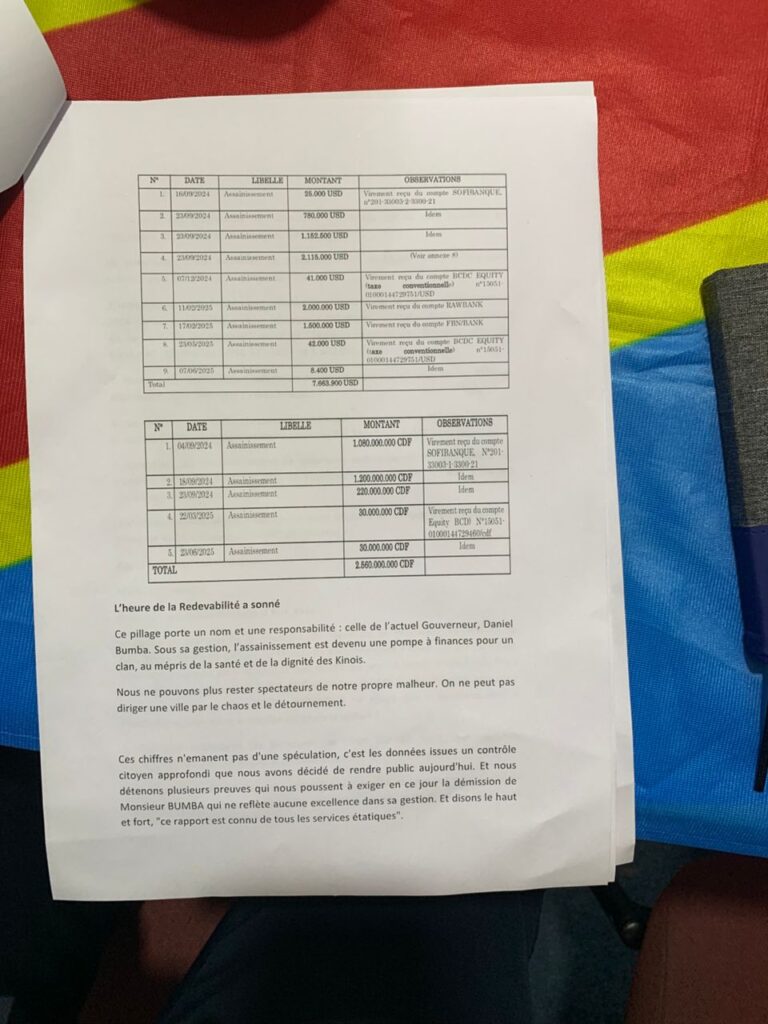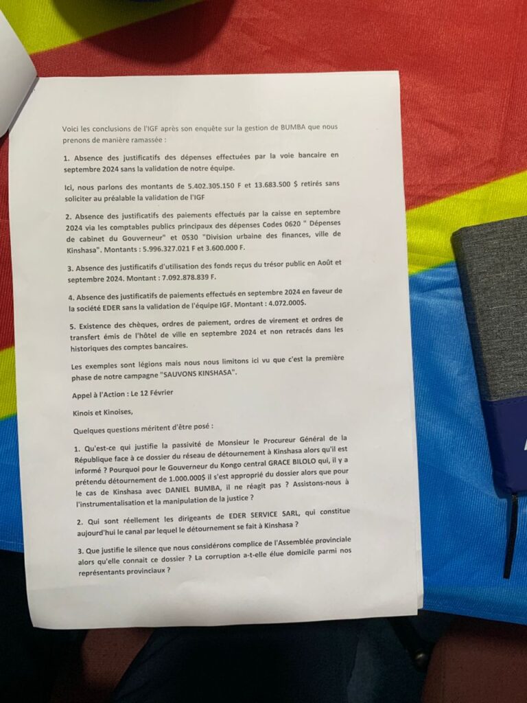 Cette initiative vise à dénoncer l’incompétence et l’inefficacité de la gestion du gouverneur Daniel Mbumba, cité dans le détournement des fonds et la création mensongère d’une entreprise privée EDER SERVICE S.A.R.L que gère par personnes interposées Daniel BUMBA, laquelle d’entreprise qui gère discrètement les fonds qui viennent de partout et qui constitue à ce jour le canal du détournement de l’argent du trésor urbain, de l’enrichissement illice, selon les preuves que détient le collectif.