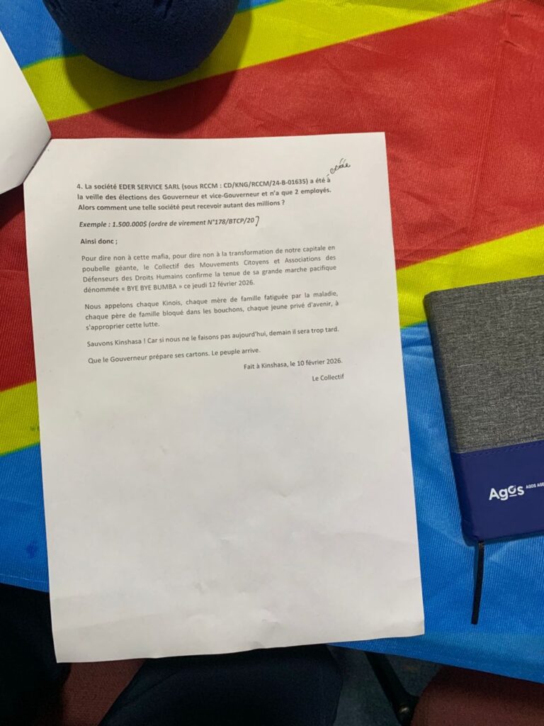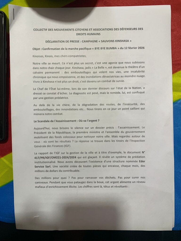 De ce fait, avant de saisir le Procureur Général de la République et la Présidence de la République en sit-in, cette structure non partisane appelle les Kinois(es) à une marche citoyenne ce jeudi 12 février 2026, avec comme objectif de réclamer la démission sans délai de l’actuel gouverneur de la ville province de Kinshasa et fait appel à L’APPROPRIATION effective de l’ensemble des organisations luttant contre le détournement des deniers publics et la population kinoise.